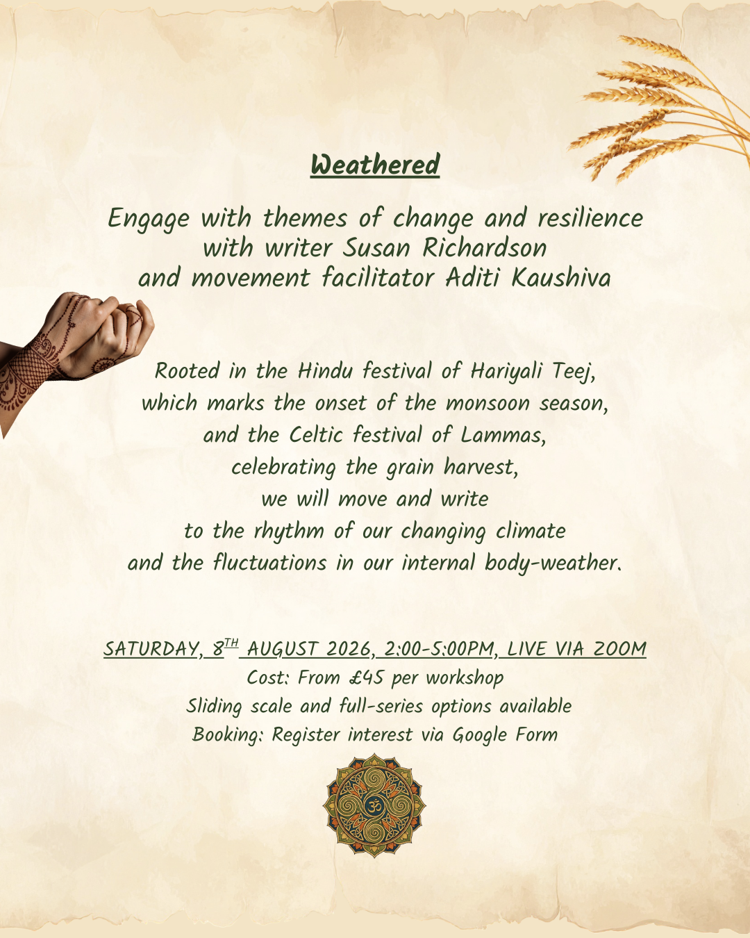 Find out more and book a place hereEngage with themes of change and resilience with writer Susan Richardson and movement facilitator Aditi Kaushiva. Rooted in the Hindu festival of Hariyali Teej, which marks the onset of the monsoon season, and the Celtic festival of Lammas, celebrating the grain harvest, we will move and write to the rhythm of our changing climate and the fluctuations in our internal body-weather.