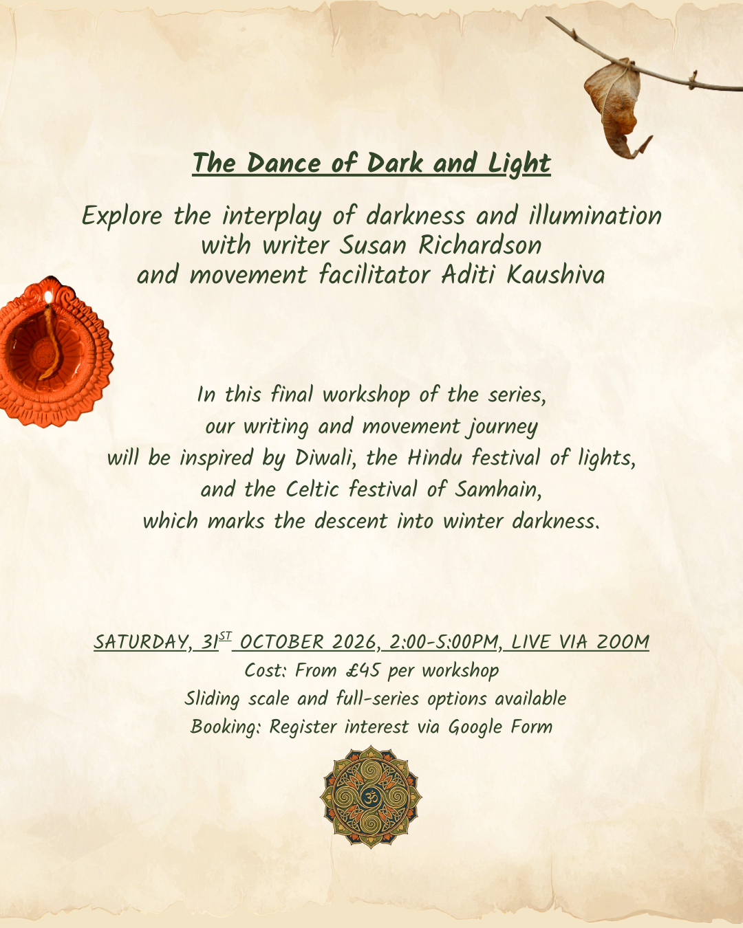 Find out more and book a place hereExplore the interplay of darkness and illumination with writer Susan Richardson and movement facilitator Aditi Kaushiva. In this final workshop of the series, our writing and movement journey will be inspired by Diwali, the Hindu festival of lights, and the Celtic festival of Samhain, which marks the descent into winter darkness.